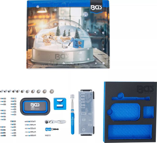 BGS tööriistade advendikalender on praktiline ja efektne kingiidee igale tööriistasõbrale. Kalendris on 24 akent, millest igaühe taga peitub uus tööriist või lisatarvik. Komplekt on paigutatud tugevasse vahtmaterjalist alusesse ning sobib suurepäraselt nii töökotta, garaaži kui ka kontorisse pühadehooajaks silmailuks.