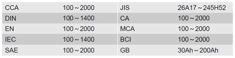 Sobib standartitele CCA, JIS, DIN, CA, EN, MCA, IEC, BCI, SAE, ja GB