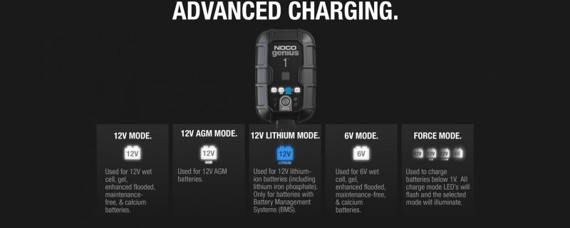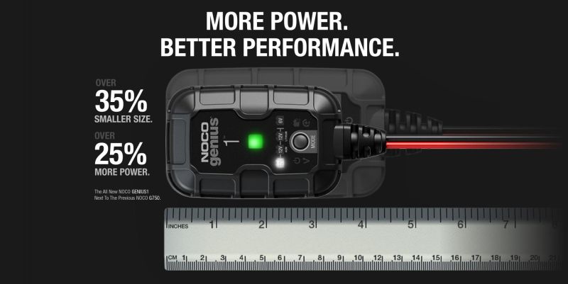 Eelkäijaks on NOCO G750 Smart Charger, uuenenud NOCO Genius1 laadija on 25% väiksem mõõtmetelt ja 35% võimsam.
