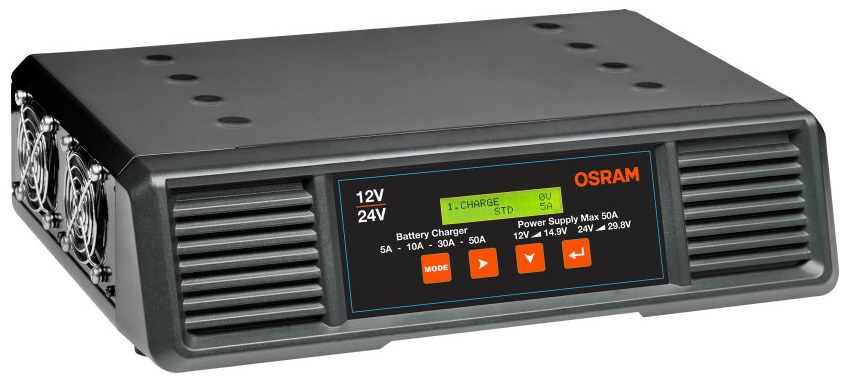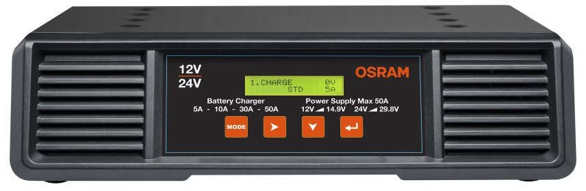 OSRAM BATTERYcharge PRO 50A on professionaalne intelligentne akulaadija, mis sobib paljude erinevate akutüüpidega 12 V ja 24 V sõidukitele. Ideaalne kasutamiseks, kui on vaja hooldada erinevaid sõidukeid ja isegi terveid autoparke, eriti professionaalsetes töökodades või müügisalongides. Valides erinevaid akutüüpe ja laadimistasemeid, saab kasutaja määrata erinevatele akutüüpidele vajaliku konkreetse laetuse. BATTERYcharge PRO 50A suudab edastada muutuvat laadimisvoolu kuni maksimaalselt 50A. See on võimalik nii pliiakude kui ka liitiumakude (AGM, GEL, STD, EFB, LFP, LiFePO4) ja start/stop akude puhul. Muutuva laadimiskiirusega 5A/10A/30A/50A võib pakkuda ka paindlikku aeglast või kiiret laadimist, mis vastab iga kasutaja individuaalsetele vajadustele. Integreeritud testimisfunktsioon võimaldab lisaks diagnoosida akut ja generaatorit. OSRAMi professionaalne integreeritud LCD-ekraaniga akulaadija läbib liitiumakude jaoks 7-astmelise laadimistsükli ja kõigi teiste akude 9-astmelise laadimistsükli, et taastada ja optimeerida aku jõudlust ning parandada laengu säilimist. Tänu oma kergele kaalule on OSRAMi professionaalset laadijat lihtne töökojas kaasas kanda ja transportida.