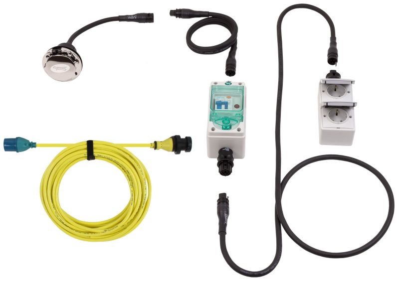 WhisperPower Shore'i toitekomplekt koosneb 15 meetri kollasest maapealsest toitekaablist ja hoiukotist, kompaktsest 16 A roostevabast terasest sisendist signaal-LED-iga (toide sisse / välja), ühenduskaablist, mis ühendatakse voolulekkekaitsega elektrikilpi (GFI) ) ja kaabliühendusega topeltpesaga pistikupessa. Kõik ühendused on veekindlad, kogu süsteem vastab CE eeskirjadele.