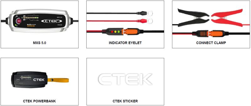 Komplektis sisaldub CTEK MXS 5.0 laadija, LED indikaatoriga kiirühendus, klambrid ja käepärane akupank.